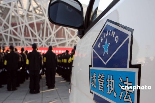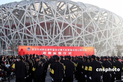 12月15日,北京奧林匹克公園城管分隊宣布正式成立。據(jù)介紹,奧林匹克公園城管分隊隸屬于奧林匹克公園管委會,共有城管隊員60人,協(xié)管員140人,以保障奧林匹克公園的良好環(huán)境秩序,重點監(jiān)控鳥巢、水立方、景觀大道、玲瓏塔等區(qū)域。中新社發(fā) 任海霞 攝