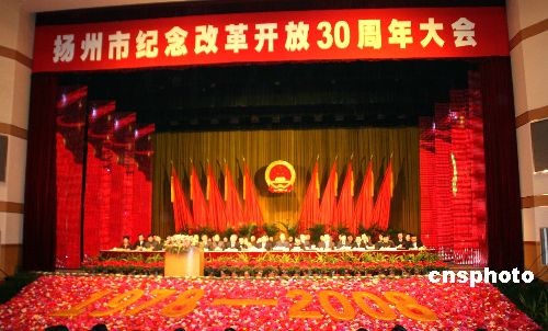 12月15日,揚州隆重召開紀念改革開放30周年大會,全面回顧揚州30年來的光輝歷程,深入總結改革開放的成功經驗,激勵全市人民堅定不移地走中國特色社會主義道路,深化改革開放,推進揚州又好又快發展,奮力實現更高水平全面小康,加快建設更加富裕、文明、秀美、和諧、法治的新揚州。市委書記季建業在大會上發表重要講話,市長王燕文主持大會。中新社發 崔佳明 攝
