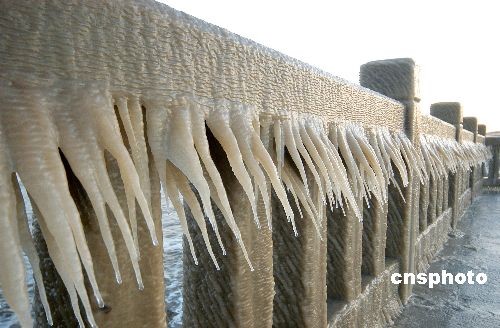 12月22日,連云港受強冷空氣影響,最低氣溫零下8攝氏度。在西北大風(fēng)作用下海上生成了滔天巨浪,濺在海岸邊護欄上的海水凍結(jié)成了晶瑩剔透的冰凌,沙灘上也是白茫茫的一片雪地,給寒冬里的連云港海濱增添了一道生態(tài)風(fēng)景線,不少游人觀賞到難得一見的景觀。中新社發(fā) 王春 攝