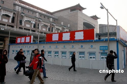 12月26日,北京西站廣場上搭建起“臨時售票窗口”,為2009年春運做準備。2009年春運將從元月11日至明年2月19日結(jié)束,為期40天。今年春運的特點是學生流和民工流探親流三流重疊,春運壓力空前集中。針對近日來迅猛增長的節(jié)前客流,為方便旅客購票,春運期間北京站和西站會將在站前廣場開辟臨時售票窗口,方便旅客購票。中新社發(fā) 鄭雄增 攝