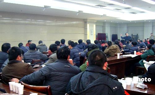 12月26日下午3時許,三鹿液態奶山東經銷商聚集石家莊市三鹿集團總部討要貨款,在得知此次石家莊市政府新出臺的還款方案并未涉及山東液態奶經銷商后,百余經銷商情急之下登至三鹿集團五層高的辦公樓樓頂,直至當地特警出動,將經銷商們勸下樓頂,事態才得以控制,整個過程持續近一小時。圖為山東經銷商被請進會議室后,與三鹿集團有關負責人就還款事宜進行協商。中新社發 牛琳 攝
