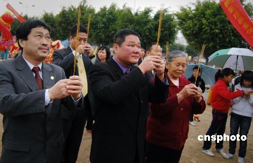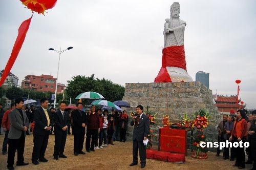 十二月二十七日,臺灣鹿港天后宮敬贈媽祖神像揭彩儀式在福建泉州霞洲媽祖宮舉行。由臺灣鹿港天后宮專門敬贈的一尊高五米、底座三米的媽祖神像,放置在霞洲媽祖宮外,供善男信女朝拜。霞洲媽祖宮迄今有近四百年的歷史,在政府撥款三百七十萬元人民幣重建媽祖宮的過程中,得到了眾多海外僑胞特別是臺灣同胞的慷慨解囊。中新社發 傅丹丹 攝