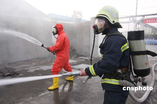 12月27日,江蘇連云港海州區人防辦聯合消防、安監、衛生、環保等單位在海州區德邦精細化工廠舉行學品事故處理應急演練,旨在通過演練,提高企業節日期間突發性事故應急處置能力。中新社發 穆道勇 攝