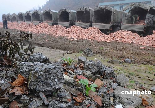 2009年元旦節(jié),解放軍成都軍區(qū)重返地震災(zāi)區(qū)的運(yùn)輸部隊(duì)冒著余震小雨,從重慶為重災(zāi)區(qū)北川縣曲山鎮(zhèn)災(zāi)民無(wú)償運(yùn)來(lái)重建家園急需的紅磚。中新社發(fā) 賈國(guó)榮 攝