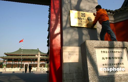1月4日,中國國家圖書館方志館正式掛牌。國圖方志館位于文津街7號,與原有的國圖古籍館同址。在方志館臨瓊樓一層,還將新開設地方文獻第一閱覽室和地方文獻第二閱覽室,專門為讀者提供地方文獻資料服務。中新社發 富田 攝