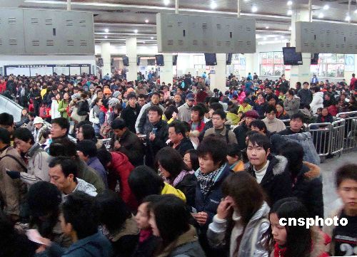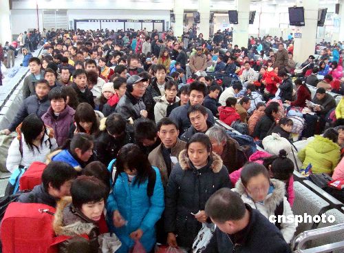 2009年1月6日,許多旅客在蘇州火車站候車廳候車。近日,隨著新春佳節臨近,蘇州火車站客流量明顯增加,不少在蘇州的農民工紛紛返鄉,蘇州火車站提前迎來農民工返鄉客流高峰。中新社發 王建康 攝
