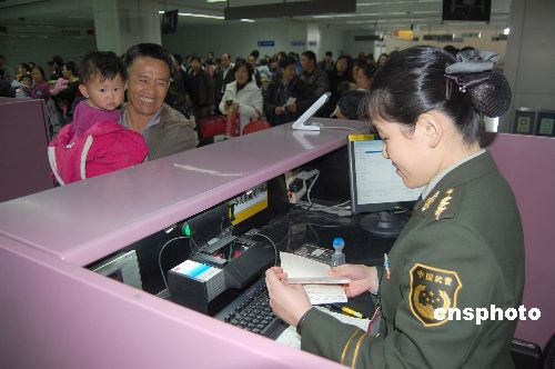 一月十一日,春運首日,福州長樂國際機場迎來旅客入境高峰,入境旅客較平日大幅增長。針對春運旅客入境高峰,福州機場邊檢站調整現場執勤警力,開足通道,加強引導,全力保障旅客快速通關。中新社發 龍景定 攝