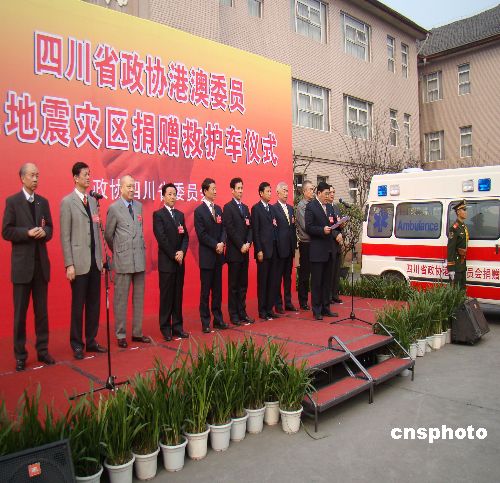 1月14日,參加政協四川省十屆二次會議的港澳委員向地震災區捐贈了一批救護車,用以改善地震災區受贈醫療機構醫療衛生設備缺乏現狀。圖為救護車捐贈儀式現場。中新社發 王萌 攝