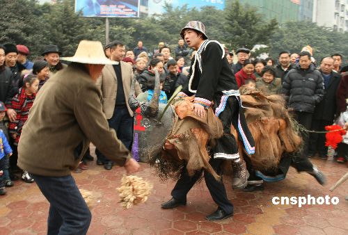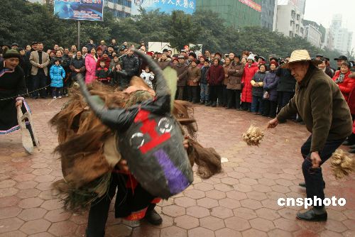 1月30日,農(nóng)歷正月初五,四川省洪雅縣瓦屋山鎮(zhèn)復(fù)興村84歲村民毛清全帶領(lǐng)該村10多名村民,到眉山市城區(qū)表演當?shù)孛袼住芭簾簟薄?/p>
