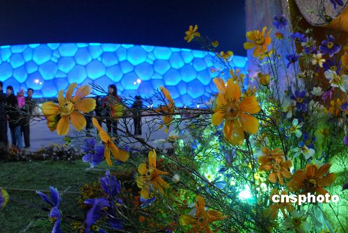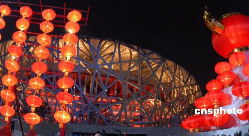 2009年1月31日晚,北京奧林匹克公園迎來的首個春節已過半,但喜慶氣氛依然高漲,游人絡繹不絕。最為醒目的是景觀大道兩側布置兩組15米高的燈籠墻——2800個大紅燈籠一字排開。此外,“金牛獻!、“年年有余”、“鴻福滿倉”等鋼材結構的雕塑,被安放在園區人流較集中的地方。中新社發 胡慶明 攝