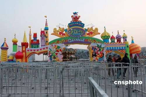 2月3日,北京奧運(yùn)中心區(qū)環(huán)球嘉年華的各項(xiàng)準(zhǔn)備工作正在加緊進(jìn)行中。距離鳥(niǎo)巢僅200米的“環(huán)球嘉年華”項(xiàng)目面臨著嚴(yán)格的審批,由于手續(xù)尚未辦妥,原定于正月初五的開(kāi)放時(shí)間被延遲至月底。環(huán)球嘉年華是奧林匹克公園公共區(qū)的首個(gè)大型室外娛樂(lè)項(xiàng)目,占地5萬(wàn)平方米,設(shè)有近百個(gè)游樂(lè)項(xiàng)目。中新社發(fā) 鄭雄增 攝