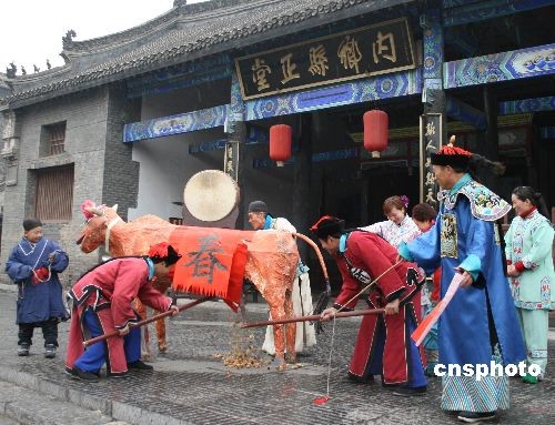 2月4日是立春節氣,在河南內鄉縣衙,身著清代服裝的工作人員,在表演“打春牛”節目。中新社發 張中立 攝