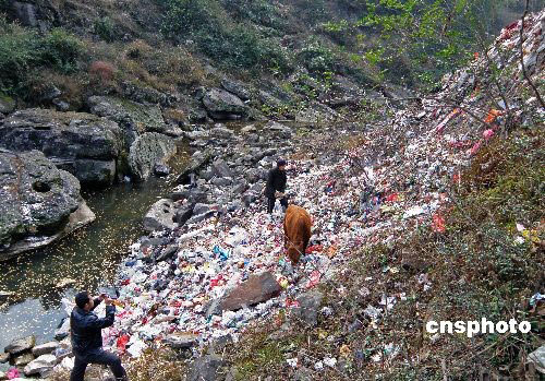 2月4日,重慶市云陽縣新陽鄉新陽小鎮,被各種垃圾污染后的新陽小河令人觸目驚心。據了解,新陽小河是長江三峽庫區的小支流,是飲用水源一級保護區,由于沒有垃圾處理站,當地居民及街道環衛人員習慣把垃圾直接倒在河邊及河中,洪水季節,這些垃圾將被洪水沖入三峽水庫。中新社發 劉君鳳 攝