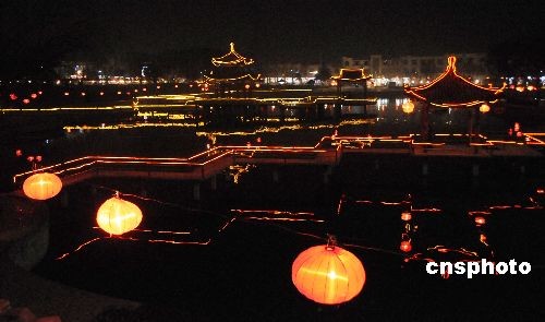 2月7日晚在山東省棗莊市山亭區太清湖公園內拍攝的元宵燈海。連日來,山東省棗莊市山亭區太清湖公園內張燈結彩,喜迎元宵佳節。夜幕下的湖中倒影璀璨繽紛,整個公園仿佛燈的海洋。中新社發 李宗憲 攝