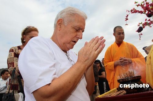 圖為外國游客參加南山元宵節祈福法會。