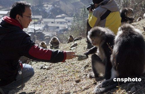 圖為2月8日在保護區內,護林員向滇金絲猴投喂松蘿。中新社發 劉冉陽 攝