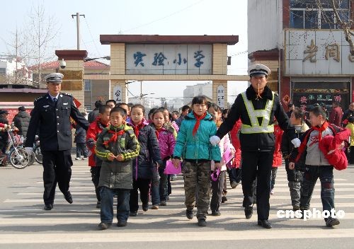 2月10日,交通民警護送小學(xué)生安全過馬路。當(dāng)日是山東省棗莊市各中小學(xué)開學(xué)首日,棗莊市臺兒莊區(qū)公安交警大隊在中小學(xué)門前設(shè)立“護校崗”,增派警力負責(zé)指揮疏導(dǎo)學(xué)校門前的交通秩序,護送上下學(xué)的廣大師生安全過馬路,保證了轄區(qū)廣大中小學(xué)生高高興興上學(xué),平平安安回家。中新社發(fā) 高啟民 攝
