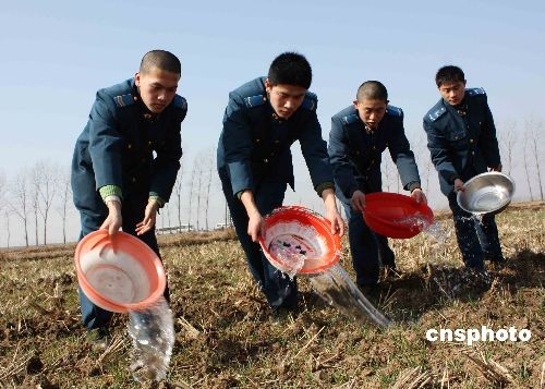 2月10日,官兵正在幫助駐地群眾澆灌麥苗抗旱。連日來(lái),濟(jì)南空軍某飛行學(xué)院官兵在全力以赴協(xié)助地方政府搞好人工增雨工作的同時(shí),成立了多支抗旱救災(zāi)黨員突擊小分隊(duì),千余名官兵深入到駐地農(nóng)村田間地頭幫助群眾安裝水泵、疏通渠道、澆灌引水,支援地方抗旱保苗,最大限度地減少旱災(zāi)造成的損失。中新社發(fā) 耿國(guó)慶 攝