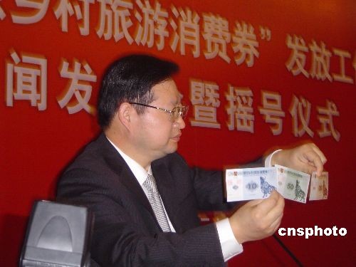 2月16日,南京市向城區居民發放2000萬元鄉村旅游消費券以帶動鄉村游,在市民代表和公證部門監督下進行公開搖號,搖中的20萬戶居民每戶獲得100元旅游消費券,可在指定的該市37個鄉村旅游點抵扣相應消費費用。圖為搖號儀式上市旅游局官員展示旅游消費券樣式。中新社發 王國安 攝
