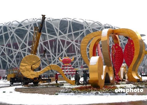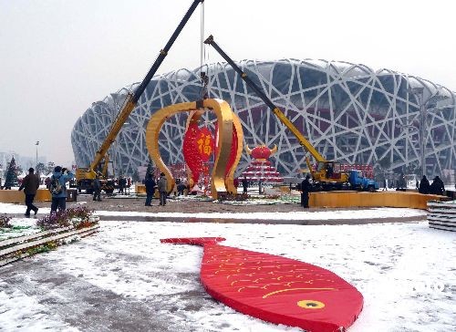 2009年2月19日,北京奧林匹克公園“鳥巢”與“水立方”之間,施工人員開始拆卸“祥云皇冠”景觀。據悉,隨著牛年春節結束,其它春節臨時景觀也將陸續拆除。中新社發 玉龍 攝