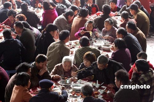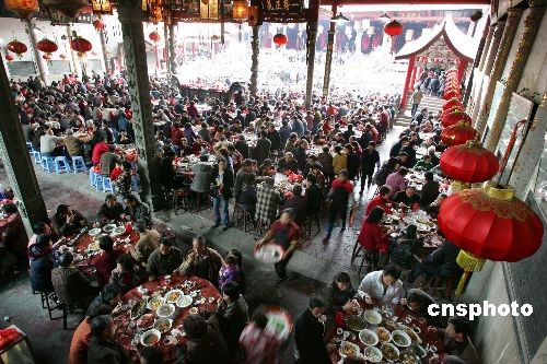 二月二十三日農(nóng)歷正月二十九,是福州傳統(tǒng)的敬老節(jié)日“拗九節(jié)”,福州倉山區(qū)城門鎮(zhèn)臚雷村陳氏祠堂里擺起千人“孝順宴”。祠堂里里外外放置一百九十多張桌子,近二千位年過半百的老人安坐席上,欣賞戲臺上演員閩劇片斷的精彩表演,而村里年輕人則忙里忙外,端菜送茶。中新社發(fā) 楊婀娜 攝