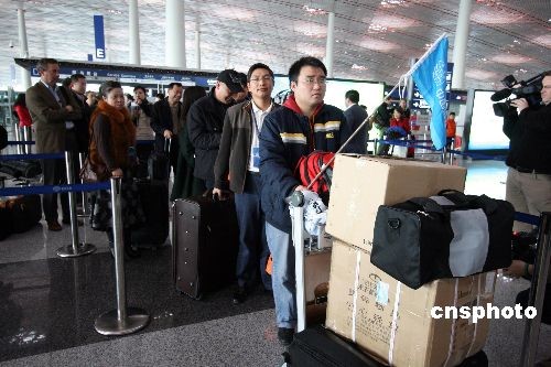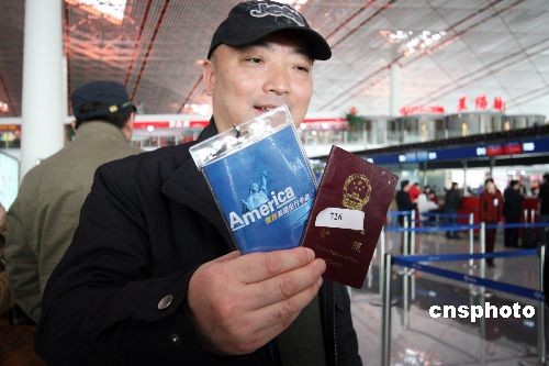 中國首個赴美購房團于2月24日在首都機場乘坐13點40分的國際航班啟程赴美。登機前,赴美購房團舉行了簡單的出發儀式。赴美購房團登機前,搜房網對團員進行了問卷調查,結果顯示,在計劃行程中的五個美國城市中,紐約以36.84%的高支持率成為最受關注的城市,接下來依次為洛杉磯、舊金山、波士頓和拉斯維加斯。中新社發 王昊 攝