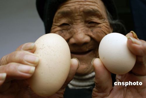2月24日,山東省棗莊市山亭區北莊鎮后峪村76歲老人秦傳蘭家的一只母雞產下一枚重127克的巨型蛋,該雞蛋長約8厘米,重127克,有3個普通雞蛋大。中新社發 王森王 攝