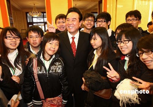2月25日,海峽兩岸關系協會會長陳云林,在北京會見來京交流的廣東東莞臺商子弟學校董事長葉宏燈及其率領的該校校董和160多名師生。圖為陳云林和臺商子弟學校學生親切交流并合影。中新社發 杜洋 攝