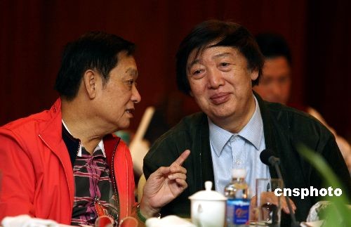 3月4日,全國政協十一屆二次會議進行小組討論,中國文聯副主席馮驥才和中國作協一級美術師韓美林在文藝小組上交流意見。中新社發 傅丹丹 攝