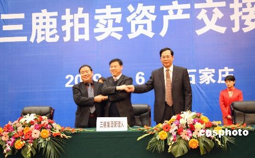3月6日,石家莊三鹿集團管理人李愛民與北京三元集團董事長張福平、河北三元總經理高青山,在河北省石家莊亞太大酒店進行了拍賣資產交接協議簽署儀式。圖為簽約儀式結束后,三人微笑握手。中新社發 翟羽佳 攝