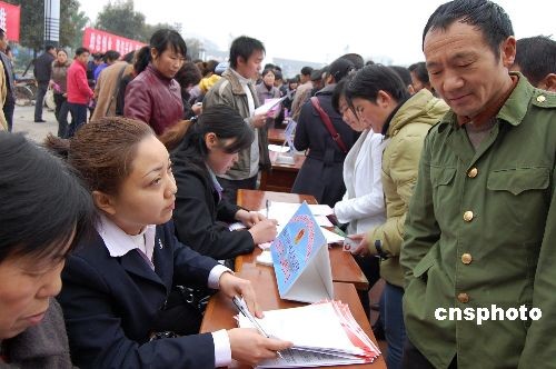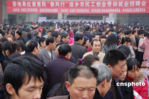 為解決農民工就業難的問題,3月9日,四川岳池舉辦“紅盾惠民春風行”返鄉農民工創業帶動就業招聘會,上萬名農民工前往應聘。共有41個單位參與招聘,提供就業崗位3400余個。中新社發 胡佐斌 攝