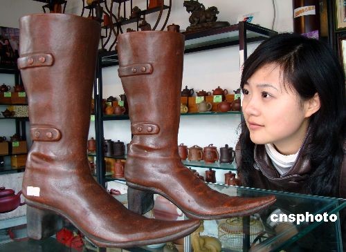 2009年3月13日,江蘇蘇州一紫砂工藝品商店內擺放的“紫砂女靴”工藝品吸引了許多顧客的目光。這些由宜興紫砂工藝師采用全手工方式制作的“紫砂女靴”惟妙惟肖,受到顧客的青睞。中新社發 王建康 攝