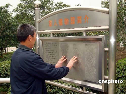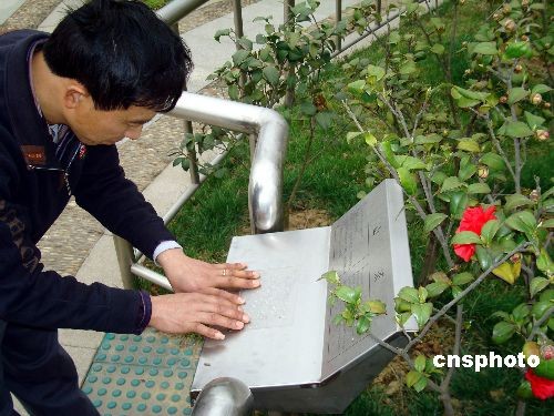 2009年3月19日,盲人在蘇州盲人植物園內(nèi)“手讀”盲文植物介紹。陽(yáng)春三月,春暖花開,一些盲人來(lái)到蘇州盲人植物園踏青“賞”花。蘇州盲人植物園占地面積12000多平方米,有60多種觀賞植物。每種花草樹木前都有盲文寫的植物介紹,還配有語(yǔ)音輔助系統(tǒng),只要盲人一觸摸,就會(huì)有相應(yīng)的語(yǔ)音服務(wù)為盲人介紹相關(guān)植物知識(shí)。中新社發(fā) 王建康 攝