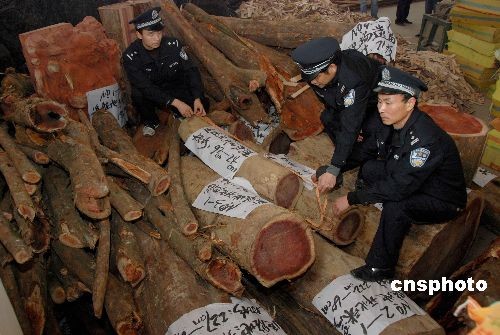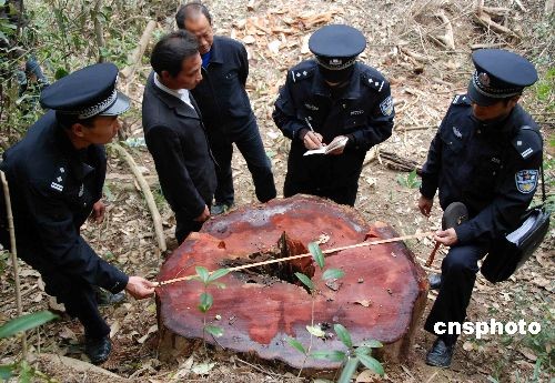 3月20日,江西省婺源縣森林公安局民警在案發現場對砍伐后的紅豆杉進行偵察。紅豆杉是國家一級重點保護野生植物。經鑒定,被盜的一株蔸部直徑為1.07米,活立木蓄積7.494立方米,樹齡為670年以上;另一株蔸部直徑為0.88米,活立木蓄積4.310立方米,樹齡為550年以上,總蓄積量達11.804立方米。目前,紅豆杉已經全部追回,14名犯罪嫌疑人員全部到案歸捕,目前此案正在進一步審理當中。 中新社發 王國紅 攝