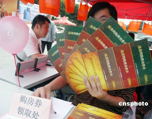 3月22日,由福州房地產協會聯合媒體和房地產商共同舉辦的發放購房消費券活動從3月20-23日開始向福州市民發放,消費券面額為1000至5000元不等,市民在指定的地點購房時出示消費券,可以獲得相等價格優惠,消費券有效期為一個月。記者在現場看到,發放購房消費券并沒有得到市民的積極響應,與其它地方發放購房消費券市民排起長龍火爆放發相比,福州市民則反應冷清。中新社發 張斌 攝