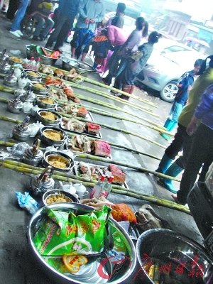 中標(biāo)男青年告訴記者,之所以愿意以高價(jià)拍得一套百元左右的祭品,是因?yàn)檫@些祭品含有祖先庇佑的意頭。