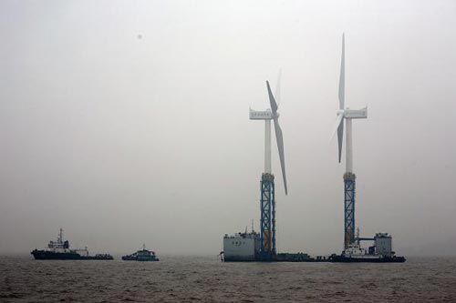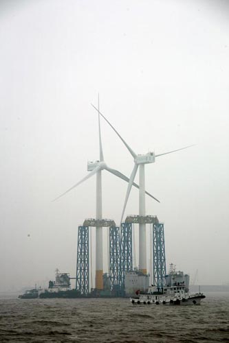 人民網上海4月5日電 昨晚,國家海上風電示范項目、上海市重大工程——東海大橋100兆瓦海上風電場的第二、第三臺風機,在上海洋山港海事處的護航和監控下,經過38海里的海上航行,被一次性運抵吊裝作業地點。