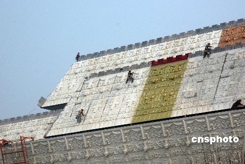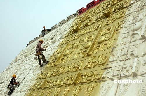 4月5日,河南省安陽(yáng)市中國(guó)文字博物館建設(shè)現(xiàn)場(chǎng),建設(shè)者們?cè)谶M(jìn)行施工。中國(guó)文字博物館自2007年在安陽(yáng)市正式開(kāi)工建設(shè)以來(lái),各項(xiàng)建設(shè)工作正在有條不紊地向前推進(jìn),2009年底有望開(kāi)館。據(jù)悉,建成后的中國(guó)文字博物館由字坊、廣場(chǎng)、主體館、倉(cāng)頡館、科普館、研究中心、交流中心等建筑組成,將是世界上第一家以文字為主題的國(guó)家級(jí)專業(yè)博物館。中新社發(fā) 常中正 攝