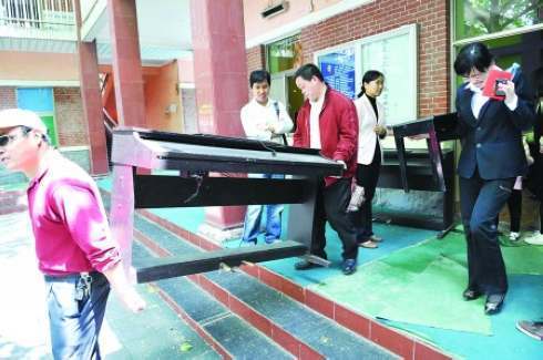 中午12點左右,部分家長開始把教室里的設施往外搬。幾位家長把數碼鋼琴房里的一架電子鋼琴搬出了教室!斑@個教室里原來有9架鋼琴,現在還剩7架,這一架是我占的。”一位50歲上下的女士對記者說,“我覺得復課是不大可能了,要求退錢又找不到領導,只好搬點東西作抵押了!