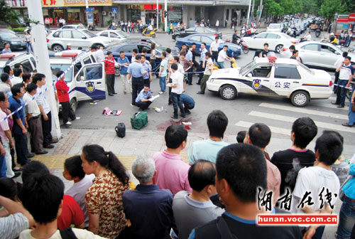 住在離事發地點100米不到的文冬輝先生看到事發的全過程:“造成這起血案的人都是在后面的‘一家子菜館’做事的,其中一人脖子上中了一刀,鮮血直冒,被120急救車送往長沙市一醫院了,兇手逃向市博物館,被博物館的保安當場抓獲。”