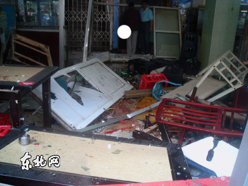 餃子館內部一片狼藉,標記處為位于地下一層的灶房入口。