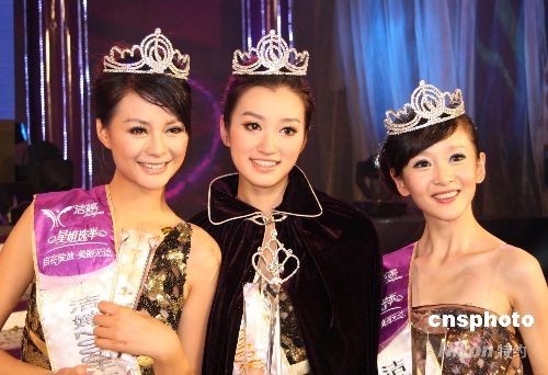 8月4日晚,2008星姐選舉在長沙落幕,圖為本年度星姐冠軍沈思倩(中)、第一亞軍沈夢辰(左)、第二亞軍王伊(右)。星姐選舉已舉辦九年,曾是中國大陸選秀節(jié)目的領(lǐng)頭羊,與往屆不同的是,本屆星姐選舉有湖南、湖北、河南三省佳麗參賽,三省媒體聯(lián)動(dòng)。中新社發(fā) 張家根 攝