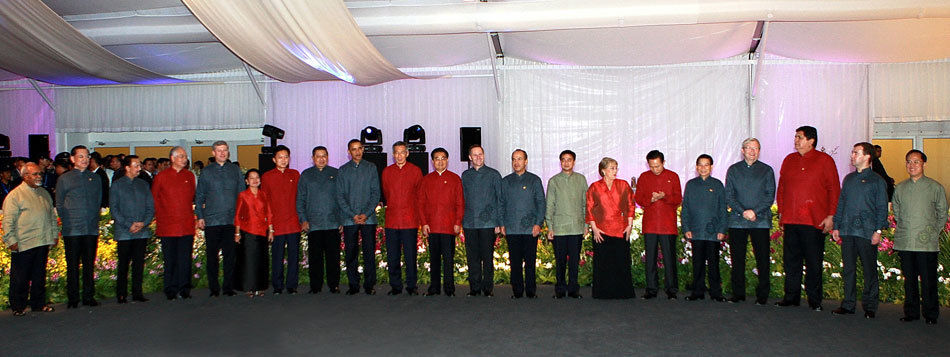 11月14日晚,出席觀看《新加坡之夜》的APEC各成員領(lǐng)導(dǎo)人拍攝了合影,剛剛抵達(dá)新加坡的美國(guó)總統(tǒng)奧巴馬也參加了合影。 >>點(diǎn)擊此處可看大圖