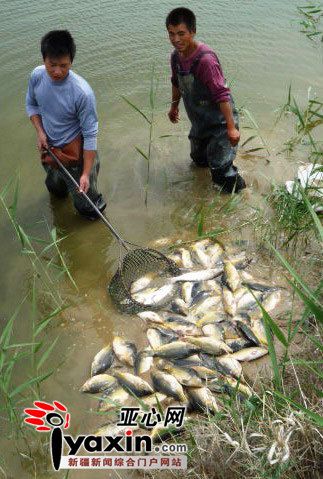 6月3日上午,記者在養(yǎng)殖戶們的魚池旁看到,工人們正在打撈池中不斷浮出水面的死魚,在此之前,四家養(yǎng)殖戶總共有近10噸的死魚被拉走,這些魚只能作為死魚賤價(jià)銷售,加上未打撈的沉在池底的死魚,總共的損失有幾十萬元。