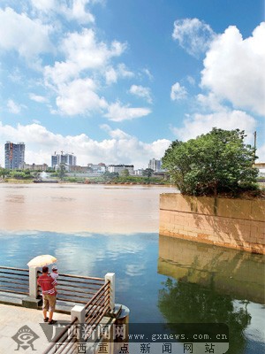 7月8日,隨著南寧市今年第一次洪峰的逐漸消退,市民發現邕江竟然出現了黃色和黑色非常分明的“鴛鴦江”景象