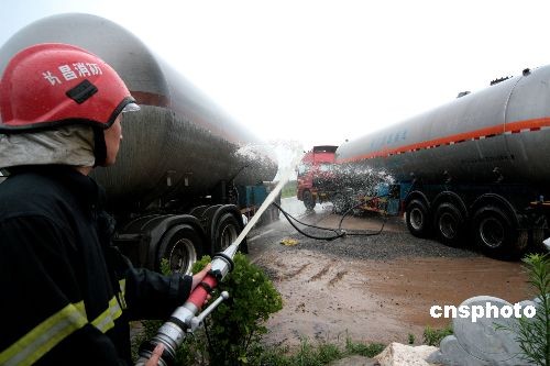 7月11日凌晨,一輛裝有20噸液化氣的大型液化氣罐車行至河南省鄢陵縣境蘭南高速公路柏梁立交橋下時,因車頂超高導(dǎo)致橋體將罐體閥門撞壞,造成罐內(nèi)液化氣嚴重泄漏。事故發(fā)生后,當?shù)毓、消防及燃氣公司等部門快速反應(yīng),迅速疏散附近群眾,并調(diào)用大型液化氣罐車卸載罐內(nèi)的液化氣。截止發(fā)稿時,搶險工作仍在進行。中新社發(fā) 牛書培 攝