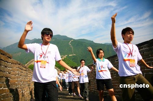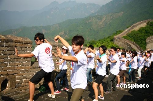 7月15日,兩岸青少年正在北京懷柔慕田峪長城舞太極。當日,北京市人民政府臺灣事務辦公室與懷柔區人民政府在懷柔慕田峪長城舉辦“兩岸青年舞動太極聚長城”活動,臺灣大學、臺中技術大學、基隆市二信中學、嘉義東石學校、新竹中信學校等院校的學生,國民黨青年發展基金會、臺灣工藝發展協會等社會團體組織成員,與北京600余名師生歡聚長城共舞太極。本次活動是“青春牽兩岸,十年大聚首——京臺青少年交流周”活動重要組成部分,旨在發揚中華民族傳統文化,聯絡兩岸師生感情,讓長城見證兩岸青少年的友情地久天長。中新社發 卜向東 攝