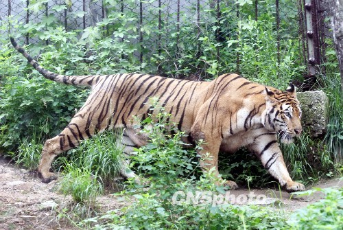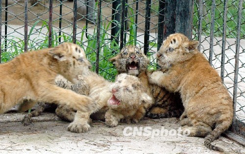 7月20日,在濟南野生動物世界,剛出生2個月的四胞胎小老虎首次走出產房與游客見面。據了解,該景區飼養的孟加拉虎“虎妞”于5月10日產下四胞胎,其中兩只是金虎,一只雪虎,一只孟加拉虎,專家介紹,一胎產下3個品種的虎崽,在國內還是首次出現。另據了解,虎有3種基因的顏色,黑色、黃色和白色,其中黑色與黃色是顯性基因,白色為隱性基因,當黃色基因不能表達時,被白色基因掩蓋,就生出白虎,黑色與黃色基因都沒有表達時,白色基因就成為顯性基因,就生出雪虎,當白色與黑色基因變成隱性基因時,就會生出金黃色的虎,也稱為“金虎”。中新社發 龔輝 攝