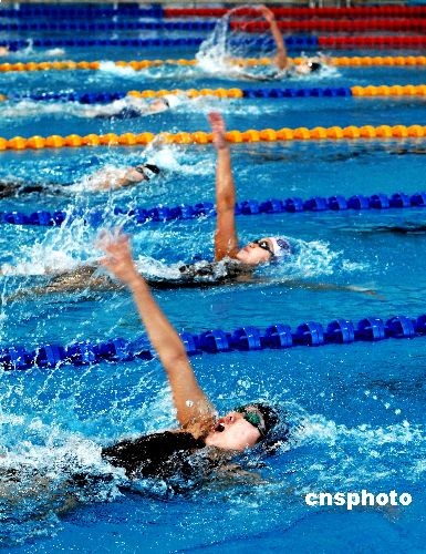 6月25日,為期五天的第十一屆全運會游泳預選賽暨2009年全國青年游泳錦標賽落下帷幕。本次比賽為第十一屆全運會游泳決賽的資格賽,分別在天津和大連兩個賽區舉行,達標運動員取得了將于今年十月份舉行的全運會游泳決賽的資格。天津賽區有江蘇、浙江、安徽、福建、廣東等14支代表隊的252名選手報名參賽;大連賽區有北京、遼寧、上海、貴州、解放軍等12支代表隊的314名選手報名參賽。中新社發 劉德斌 攝