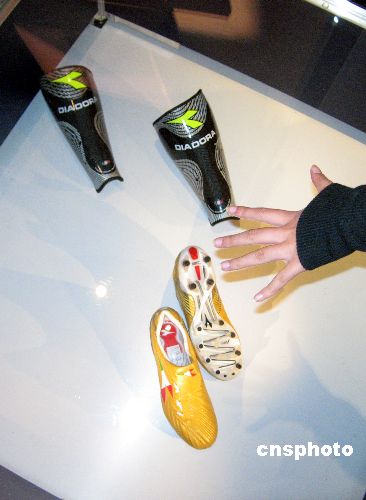 十一月十日,“2007米蘭設(shè)計(jì)制造展”在上海開(kāi)幕,為意大利贏取2015年世博會(huì)主辦權(quán)造勢(shì)。意大利球星托蒂的“世界杯紀(jì)念球鞋”及蘊(yùn)涵高科技的球員“護(hù)脛”隨這一展覽首次亮相上海。據(jù)介紹,這雙金色的足球鞋,是典型的米蘭設(shè)計(jì)風(fēng)格,使用金色袋鼠皮配合意大利國(guó)旗的三色標(biāo)志,鞋跟部的四顆星,象征意大利國(guó)家隊(duì)四度贏得問(wèn)鼎世界杯。中新社發(fā) 許曉青 攝